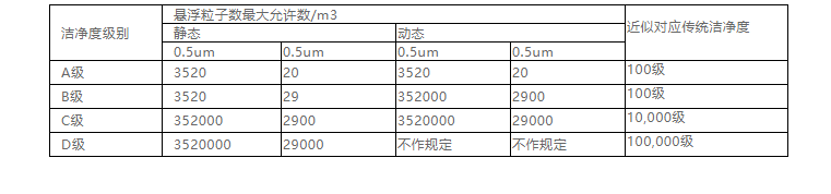 中國GMP(2010年修訂)新版GMP附錄1 無菌藥品.第三章.第九條……潔凈區(qū)各級別空氣懸浮粒子的標(biāo)準規(guī)定如下