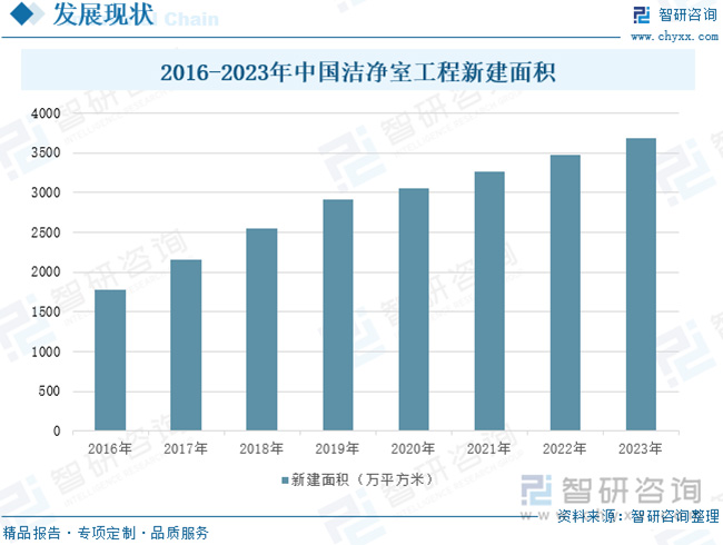潔凈室工程是服務(wù)于高科技、國(guó)計(jì)民生的常青產(chǎn)業(yè),尖端科技的發(fā)展與居民日常生活質(zhì)量的提升無(wú)不有賴于潔凈技術(shù)發(fā)展作為其幕后的支持。近幾年來(lái),隨著空氣凈化核心領(lǐng)域技術(shù)實(shí)現(xiàn)根本性突破,國(guó)產(chǎn)凈化設(shè)備及系統(tǒng)集成快速成長(zhǎng),在產(chǎn)品質(zhì)量、制作成本、凈化性能等方面取得長(zhǎng)足進(jìn)步,潔凈室相關(guān)技術(shù)與服務(wù)也從醫(yī)學(xué)、航空航天等高端產(chǎn)業(yè)逐漸向全社會(huì)滲透,在食品生產(chǎn)和流通各環(huán)節(jié)、高端裝備制造、大型數(shù)據(jù)中心、化工產(chǎn)品生產(chǎn),甚至美容化妝等領(lǐng)域都取得了廣泛的應(yīng)用。目前,全球半導(dǎo)體、光電等電子信息產(chǎn)業(yè)在世界范圍內(nèi)轉(zhuǎn)移,東亞、東南亞等地區(qū)已成為世界電子信息行業(yè)的主要市場(chǎng)和發(fā)展重心;同時(shí)由于我國(guó)醫(yī)藥衛(wèi)生、半導(dǎo)體、航空航天等事業(yè)的不斷發(fā)展,加速推動(dòng)了潔凈室的市場(chǎng)化需求,從而帶動(dòng)我國(guó)潔凈室工程產(chǎn)業(yè)的快速發(fā)展。2023年,中國(guó)潔凈室工程新建面積達(dá)3689萬(wàn)平方米,同比增長(zhǎng)6.04%。